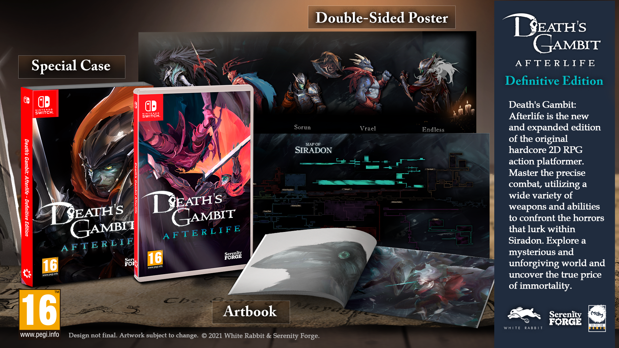 Meridiem Games, insieme a Serenity Forge, sarà responsabile della produzione e della distribuzione in Europa dell’edizione speciale in scatola di Death’s Gambit: Afterlife. La scatola stessa includerà una scatola appositamente creata con un’opera d’arte di Sorun sulla copertina, un libro d’arte unico e un poster a doppia faccia.