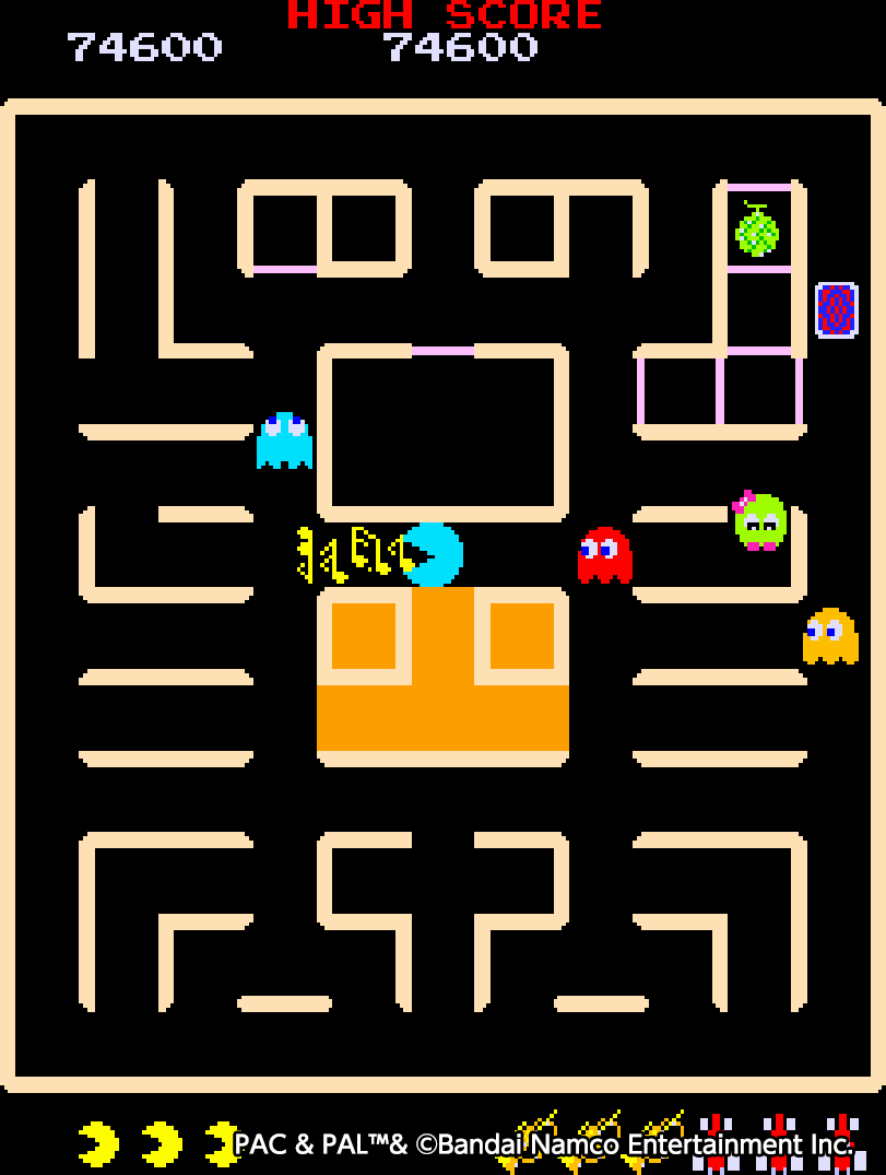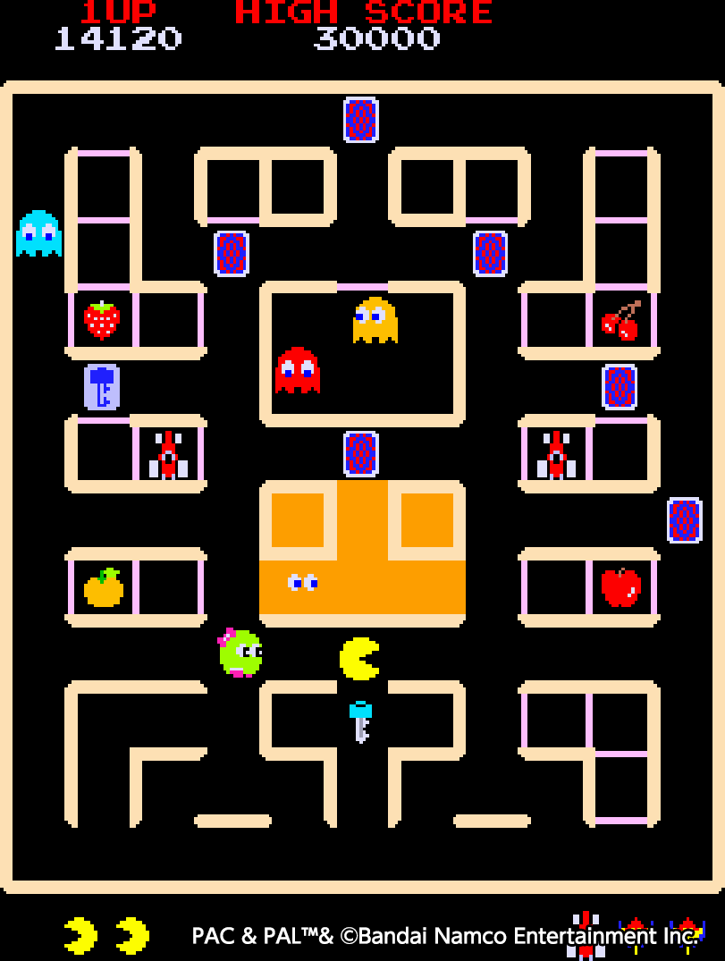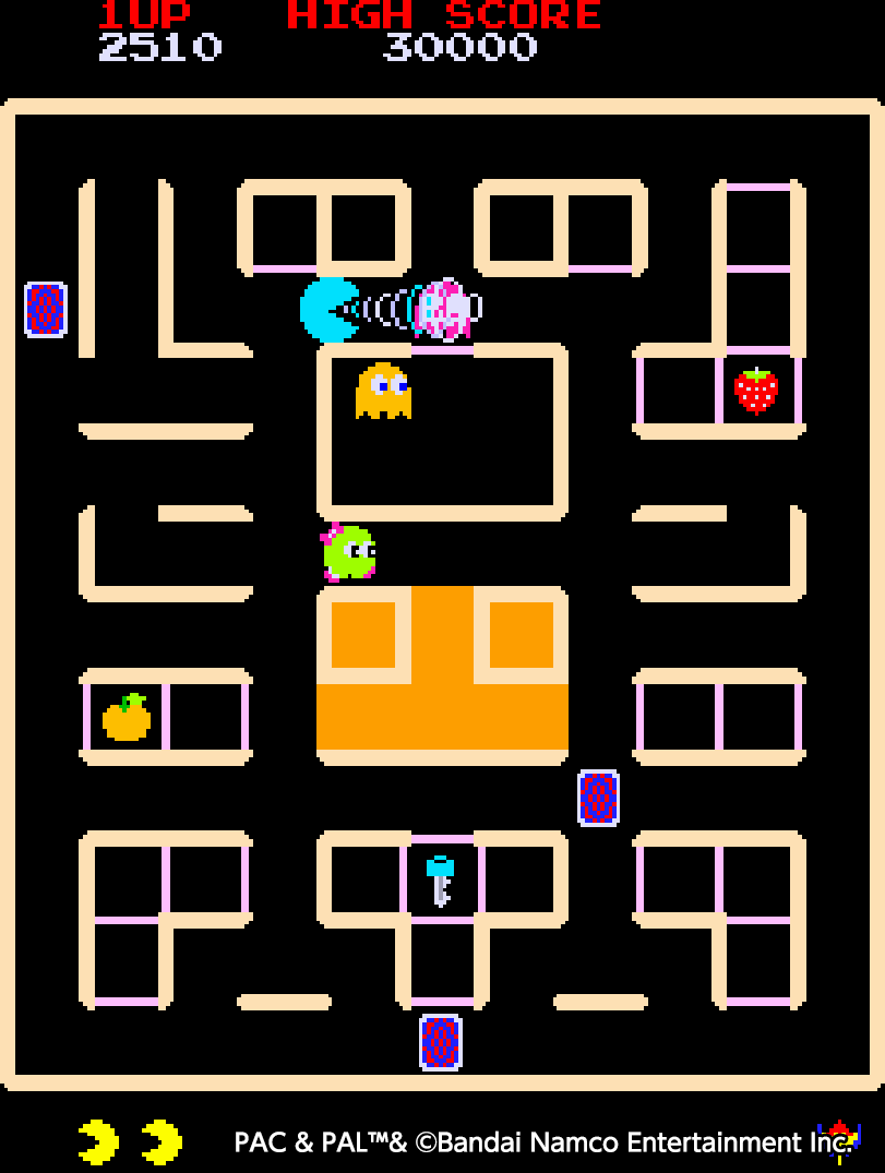 “PAC & PAL” è un gioco d’azione pubblicato da NAMCO (Bandai Namco Entertainment Inc.) nel 1983. Gira le carte e mangia frutta e obiettivi speciali per guadagnare punti.