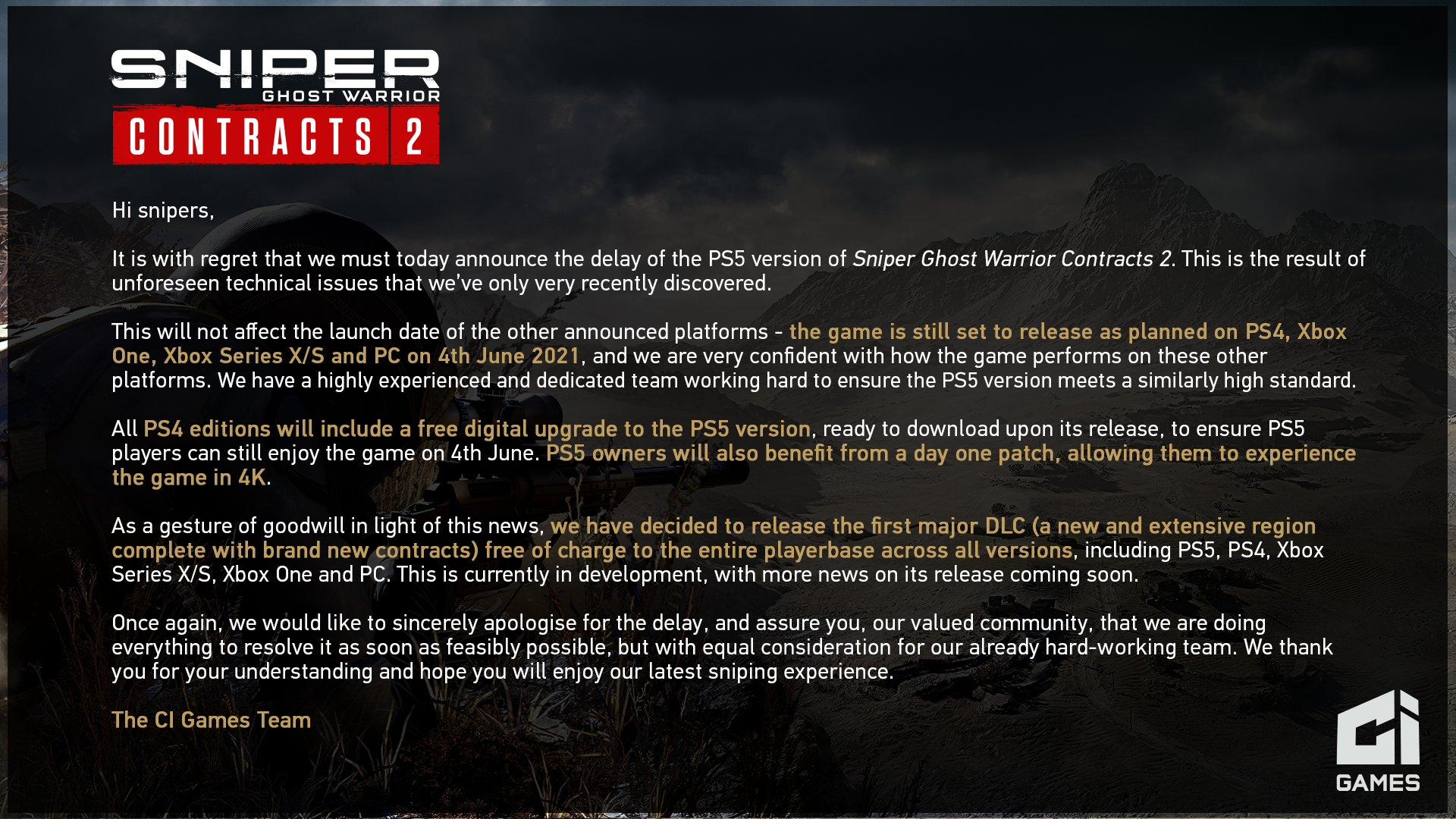 CI Games ha oggi annunciato che l’uscita della versione PS5 dell’attesissimo gioco, Sniper Ghost Warrior Contracts 2, verrà posticipata a causa di problemi tecnici imprevisti scoperti nelle settimane precedenti il lancio.